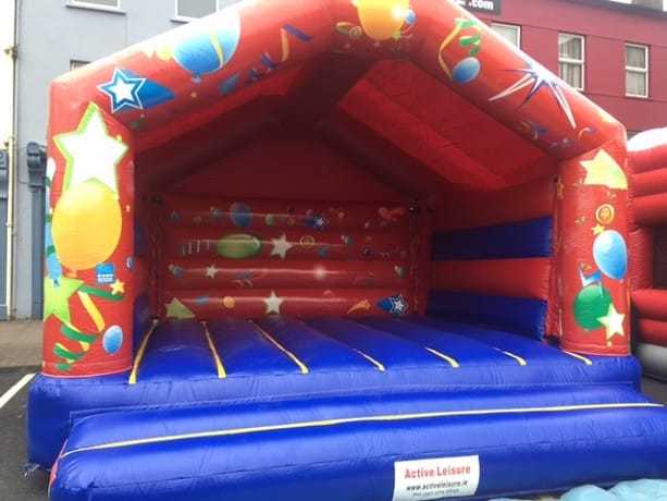 This Adult Bouncy Castle is very popular at Student events and Adult Birthdays - for the child in all of us.The front panels feature images of balloons and stars, which are digitally printed. It is a lovely A-frame castle with a rain cover and it is open at the front.