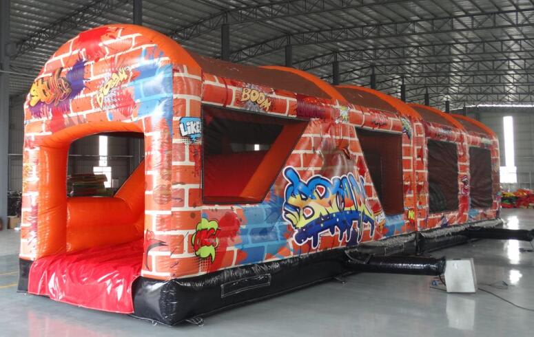 This Graffiti Obstacle Course is very popular at Children's birthday parties - Weddings, Family Fun Days, and School events. With reinforced seams, you enter the unit at the back through a series of inflatable pillars, over the climbing wall, through the tunnels and then you face a 10ft high climbing wall up to the top and then slide down the steep slide. This Obstacle course is very easily supervised from the outside as it has clear netting on each side. It is hugely popular with older children as it's graffiti design is so impressive.