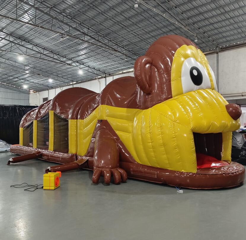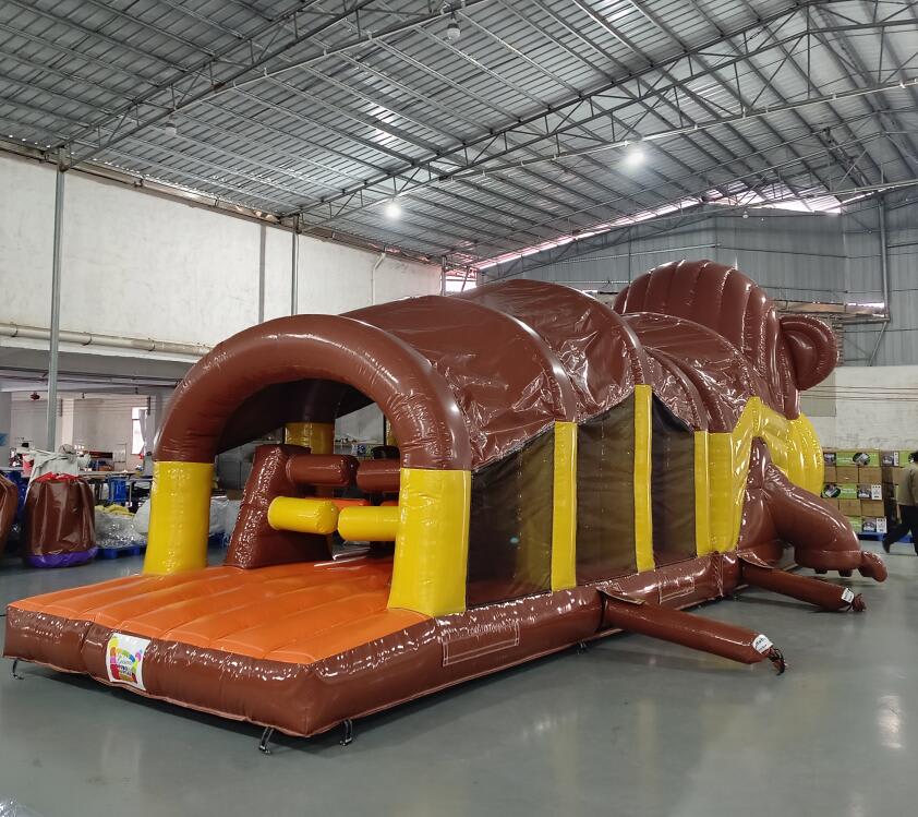 This brown and yellow obstacle course is designed to provide the ultimate challenge and entertainment for your guests. With its 36ft length, participants will navigate through various obstacles, climb walls, slide down ramps, and more! The Curious Jorge obstacle course is the perfect addition to birthday parties, corporate events, school functions, and more, guaranteeing non-stop fun and excitement for everyone involved.