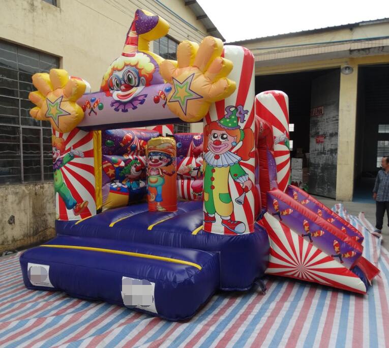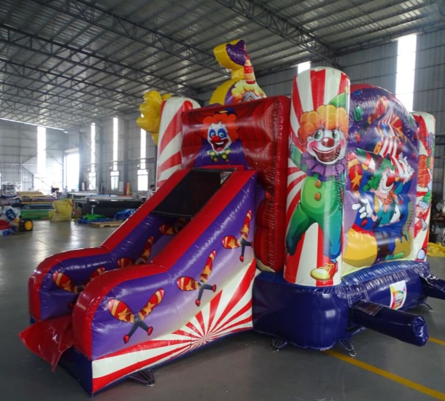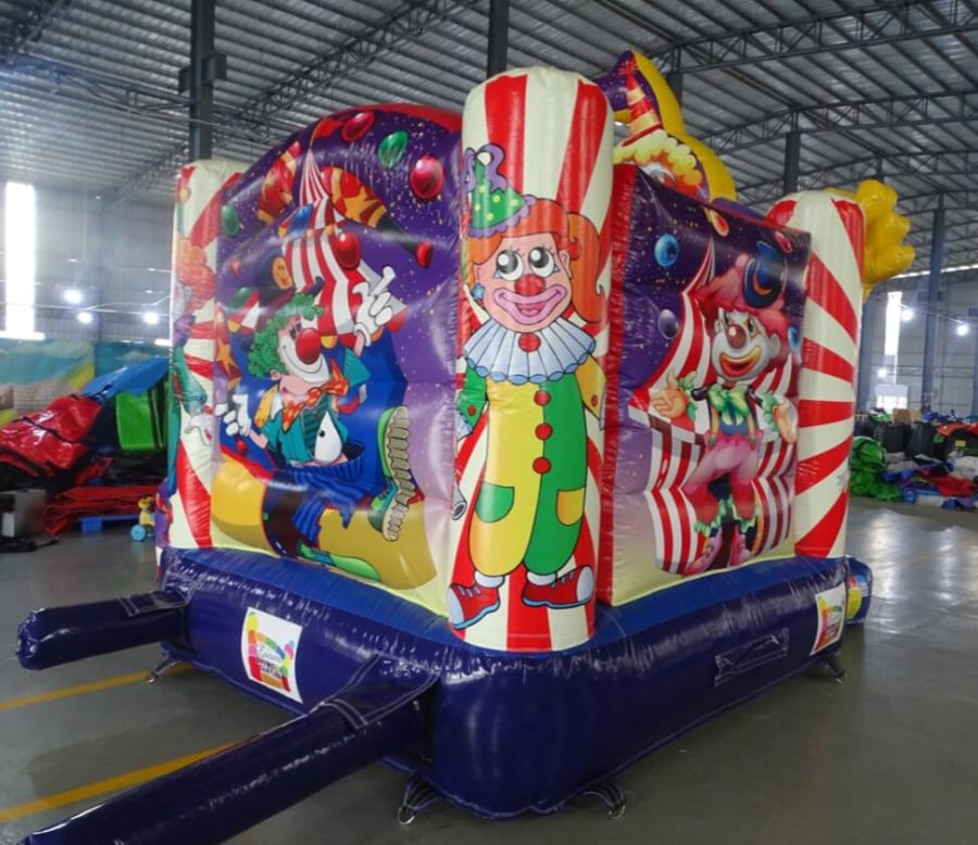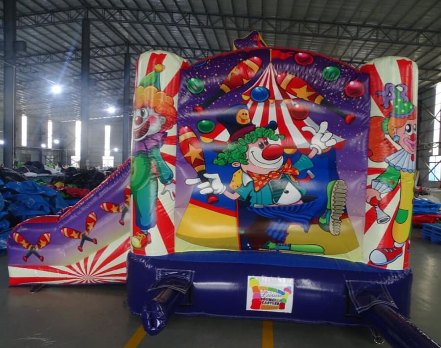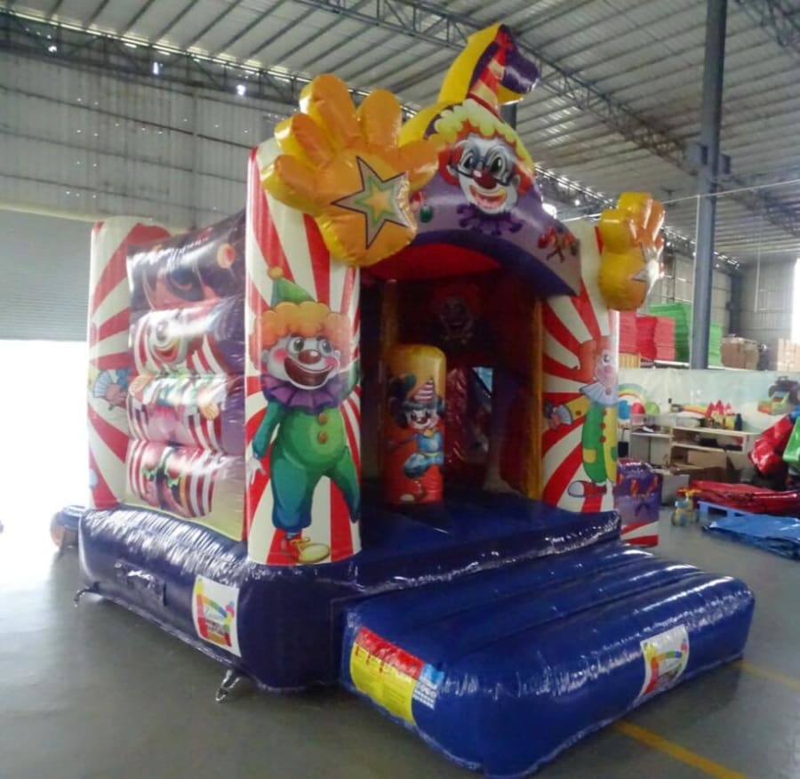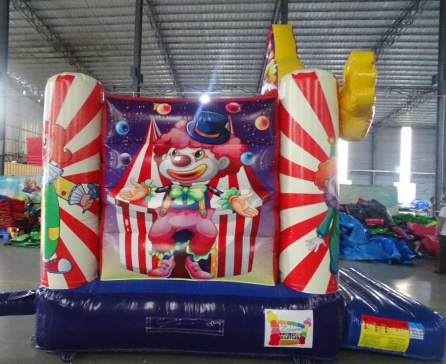 This Clown themed Slide Castle is very popular at Children's birthday parties. This castle can hold up to 6 children at a time. The panels feature images of various Clown/circus themes, which are digitally printed. It is a lovely castle with a rain cover and it is open at the front to easily supervise it at all times.