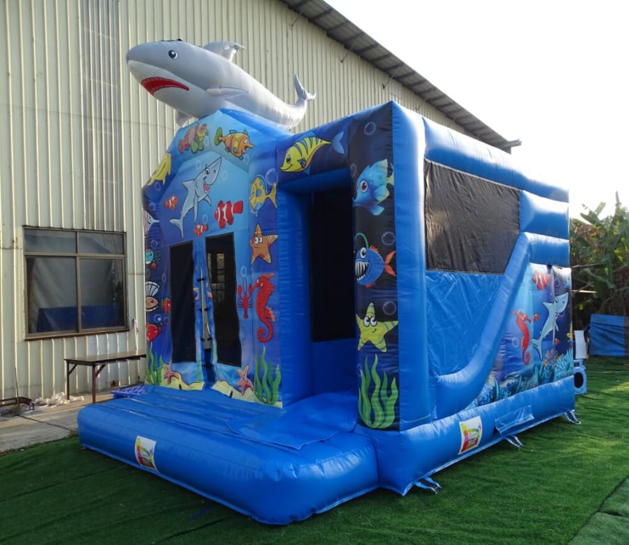 This Shark Bouncy Castle is very popular at Childrens birthday parties - Weddings, Family Fun Days, and School events. With reinforced seams and a larger bouncing area it's suitable for up to 6 children at a time. The front panels feature images of Dolphins, all digitally printed. This castle also comes with a 8ft slide to the side of the castle and an enclosed bouncing space. This castle is very easily supervised from the outside as clear netting encloses the castle.