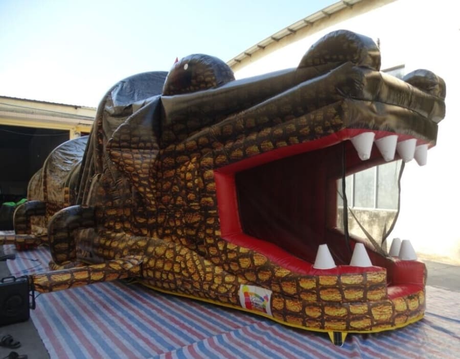 This Crocodile Obstacle Course is very popular at Children's birthday parties, Family Fun Days, and School events. With reinforced seams, this Obstacle Course is a climbing obstacle, whereby you enter through the mouth of the crocodile , over the climbing wall down the slide , through the tunnel and then out the obstacles at the back.