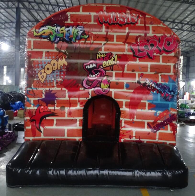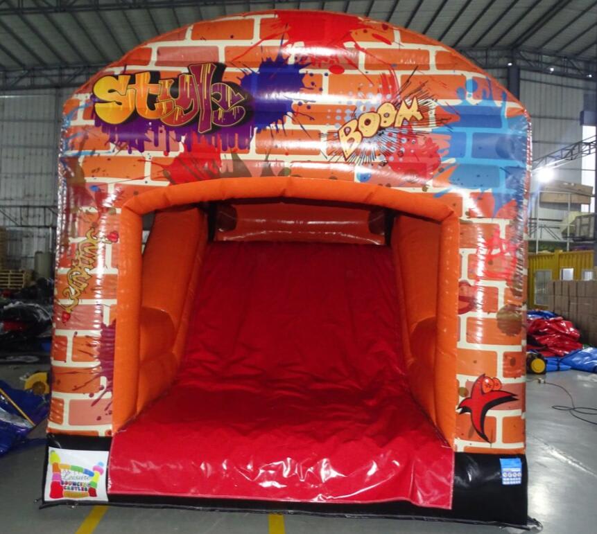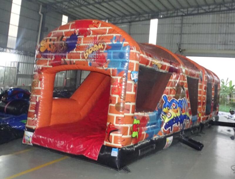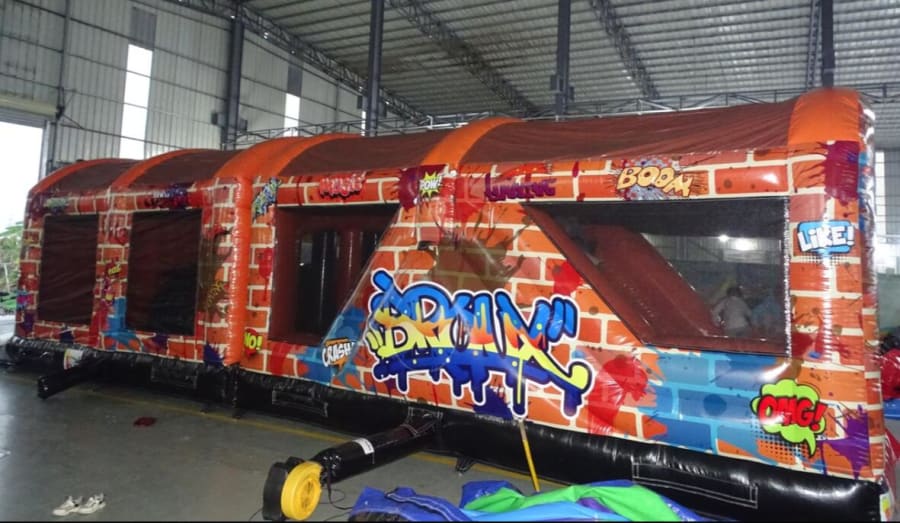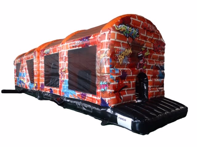 This Graffiti Obstacle Course is very popular at Children's birthday parties - Weddings, Family Fun Days, and School events. With reinforced seams, you enter the unit at the back through a series of inflatable pillars, over the climbing wall, through the tunnels and then you face a 10ft high climbing wall up to the top and then slide down the steep slide. This Obstacle course is very easily supervised from the outside as it has clear netting on each side. It is hugely popular with older children as it's graffiti design is so impressive.