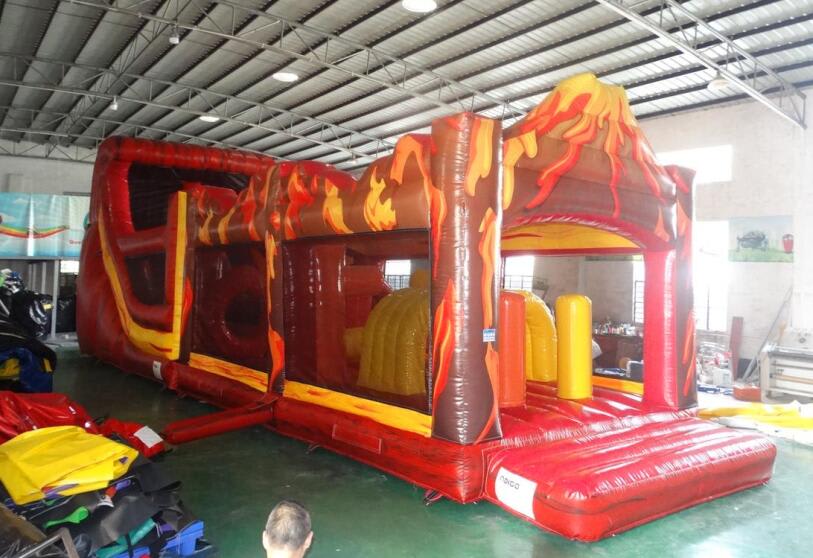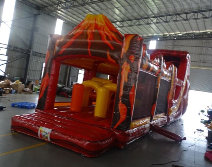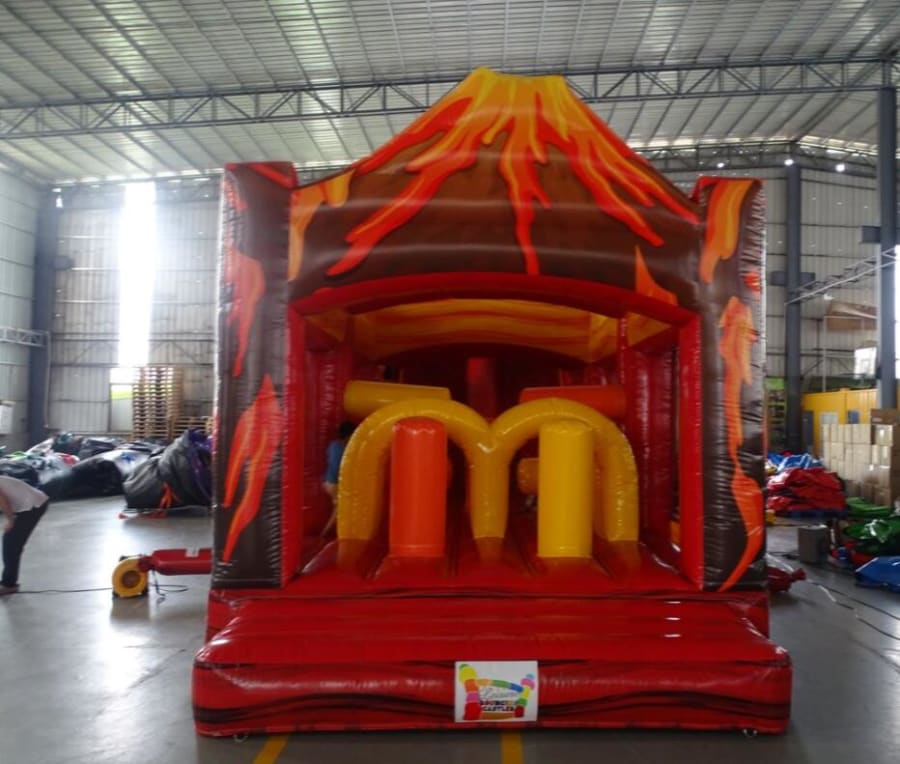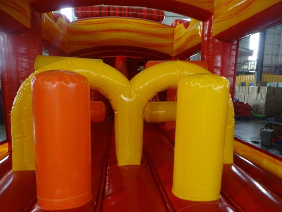 This Lava Rush Obstacle Course is very popular at Children's birthday parties - Weddings, Family Fun Days, and School events. With reinforced seams, you enter the unit at the back through a series of inflatable pillars, through the tunnels, up the steps and then slide down the steep slide. The slide leads you back into the middle of the obstacle course. It is hugely popular with older children as it's volcano design is so impressive.